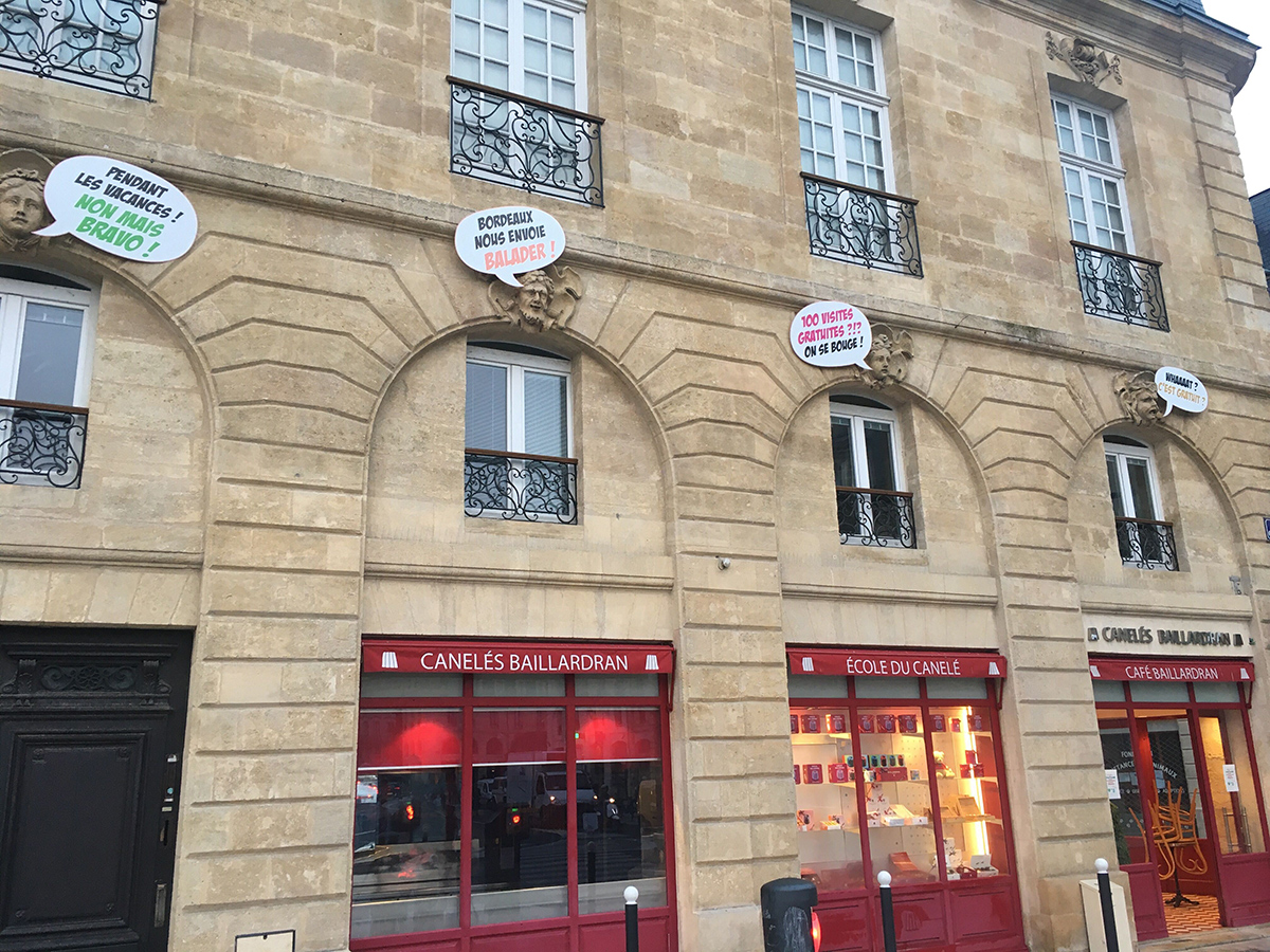 Pour sortir des sentiers battus, l’agence Passerelles, filiale du Groupe Monet + Associés à Bordeaux, a décidé d’envoyer Bordeaux balader. A travers une campagne cross-media interpellante (street marketing, réseaux sociaux, et médias), l’agence a offert un rôle inédit aux personnages de pierre emblématiques du patrimoine de la ville : les 3000 mascarons sculptés dans les façades de Bordeaux.