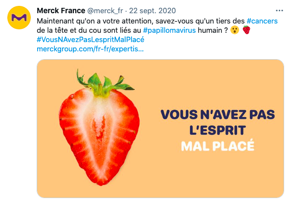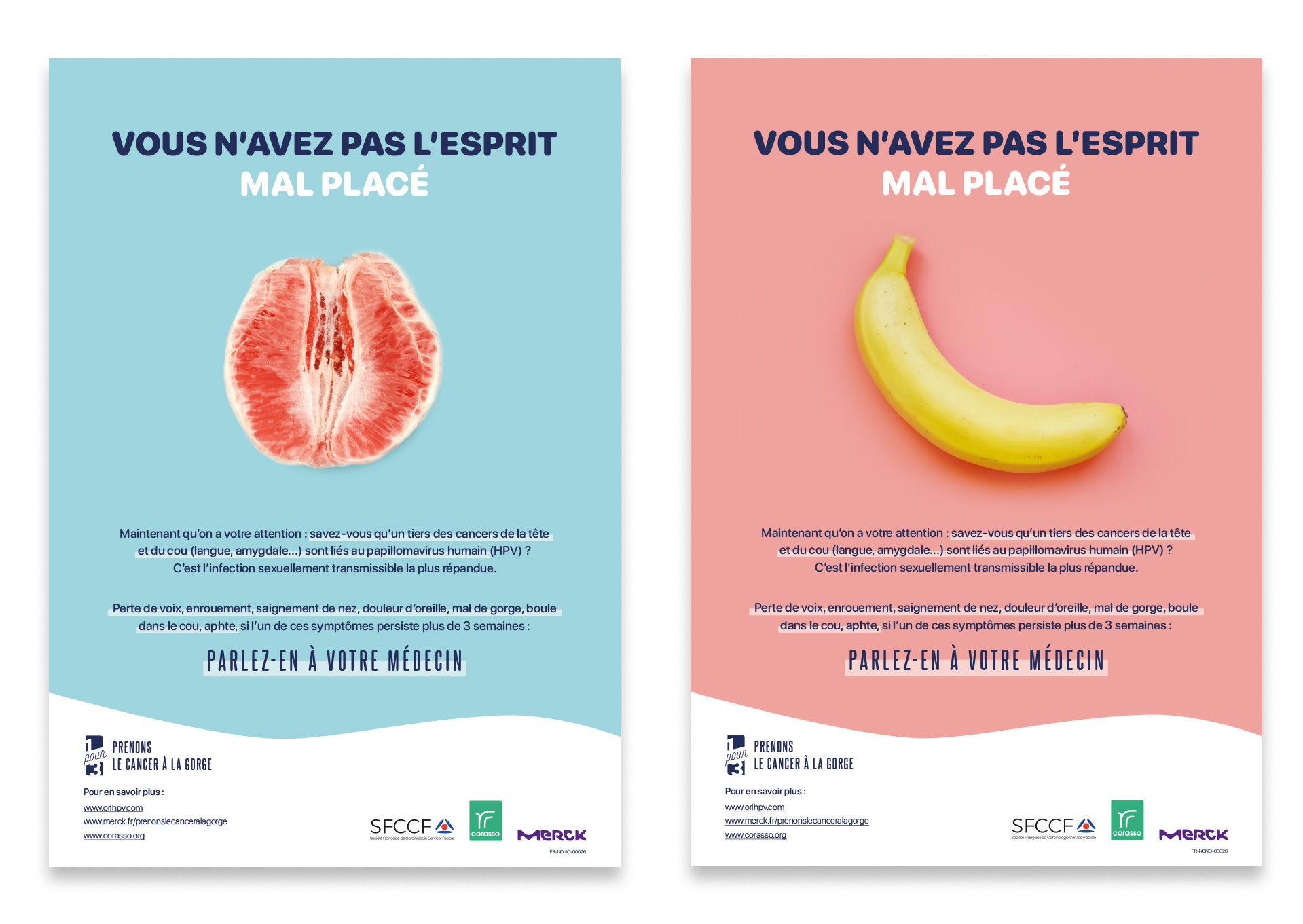 Une campagne déclinée en plusieurs affiches qui ont fait l’objet d’une série de posts sur Twitter et LinkedIn, combinée à une approche relations médias pour valoriser ses messages et faire de la pédagogie sur le lien entre papillomavirus et cancers de la tête et du cou (facteurs de risque, symptômes et importance du diagnostic précoce).