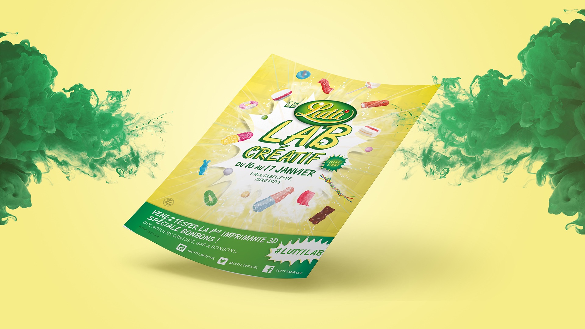 Une identité visuelle impactante et révélatrice du «Grain de Folie» Lutti est dévoilée à travers les différents supports réalisés : invitation presse, communiqué de presse, flyer, scénographie. Pour accompagner les invitations print et afin de s’assurer de l’impact qu’aura l’opération auprès des influenceurs, les logotypes des médias concernés ont été réalisés en bonbon grâce à l’imprimante 3D.