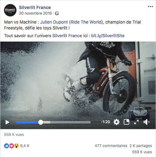 Un résultat bluffant et extrêmement positionnant pour Silverlit. Un teaser vidéo et son format long qui ont été visionnés plus de 850 000 fois en quelques jours et ont permis de créer une nouvelle affinité de marque auprès des publics ciblés. L’expérience et le résultat sont importants mais n’oublions pas l’essentiel : le ROI ! Il faut déclencher ou prescrire l’acte d’achat auprès ce des mêmes publics, et en parallèle du tournage de Man Vs Machine ont été tournées 6 capsules produits publicitaires mettant en avant les 6 drivers marketing de la marque Hong-Kongaise qui ont été diffusés avec des call-to-actions redirigeant vers les revendeurs online/offline partenaires et les différentes GMS & GSS du marché français.